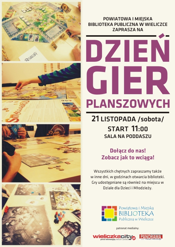 W najbliższą sobotę (21 listopada) od godziny 11:00 w Sali na poddaszu wielickiej biblioteki będzie można zagrać w najnowsze i najlepsze planszówki.