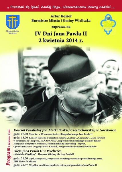 Serdecznie zapraszamy 2 kwietnia br. na IV Dni Jana Pawła II w Wieliczce. Uroczystości odbędą się w kościele parafialnym p.w. Matki Boskiej Częstochowskiej w Gorzkowie oraz na Alejach Jana Pawła II w Wieliczce.