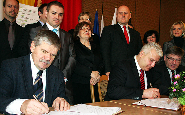 Podpisujący umowę od lewej: dyrektor Oddziału Południe Strabag Polska Paweł Prochwicz, starosta Jacek Juszkiewicz i wicestarosta Mirosław Mrozowski.