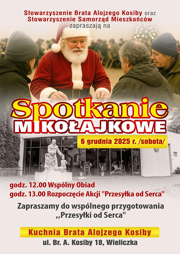Stowarzyszenie Brata Alojzego Kosiby oraz Stowarzyszenie Samorząd Mieszkańców zaprasza wszystkich chętnych na obiad z Mikołajem, który odbędzie się 6 grudnia 2025 r. o godzinie o godzinie 12.00 w Kuchni Brata Alojzego Kosiby przy ul. Kosiby 18 w Wieliczce.