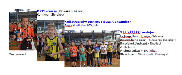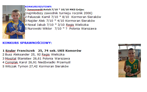 W Kampusie Wielickim odbył się V Ogólnopolski turniej mini koszykówki rocznika 2004. Na wielickiej hali spotkały się najlepsze zespoły 6 województw oraz czołowe zespoły z Czech. 16 zespołów i ponad 250 zawodników rozegrało 44 spotkania które stały na naprawdę rewelacyjnym poziomie. Najlepszymi zespołami okazały się zespoły z Wielkopolski które rozgrały między sobą mecz finałowy. Zwycięzył Kormoran Sieraków który pokonał Noblistów Wielichowo 35 – 24. W małym finale spotkały się drużyny z Czech Snake Ostrawa i BK Pribor. Zwycieżył zespół z Ostrawy. Bardzo dobrze w tym turnieju zaprezentowali się koszykarze z Wieliczki którzy zajęli 7 miejsce. Mogło być znacznie lepiej ale po wyjściu z grupy eliminacyjnej do ćwierćfinałów przegrane kilkoma punktami mecze z BK Pribor i Niedźwiadkami Przemyśl spowodowały iż w gronie 16 zespołów UKS REGIS nie awansował do strefy medalowej. W ostatnim swoim meczu wieliczanie wygrali z MKS Grójec 42-33. W turnieju odbyło się wiele konkursów a największą atrakcją był mecz gwiazdeczek czyli najlepszych zawodników poszczególnych zespołów podzielonych na północ i południe. W turnieju brały też udział 2 inne małopolskie zespoły MUKS Tarnów i Cracovia Kraków które jednak zajęły dalsze miejsca. Przez całe trzy dni zmagania młodych chłopców oglądali rodzice przybyli z całej Polski. Indywidualnie wyróżniono wieliczan Aleksandra Busza który zdobył tytuł krola strzelców oraz Łukasza Siemieńca który został najlepszym zawodnikiem UKS REGIS Wieliczka. Nagrody medale i puchary wręczali Starosta Wielicki Jacek Juszkiewicz, Zastępca Burmistrza Miasta i Gminy Wieliczka Rafał Śleczka oraz członek zarządu KOZKosz Dariusz Zawiślan. W turnieju w drużynie UKS REGIS wystąpili zdobywając punkty: Aleksander Busz 108, Łukasz Siemieniec 30, Kacper Smagur 24, Marcin Bankowicz 18, Jakub Nosal 14, Bartek Kozioł 11, Jan Pisarski 11, Krystian Nowak 8, Bartek Dumka 8, Jan Krupa 4, Patryk Śliwa 2, Jakub Marusczyk. Trenerem zespołu był Hubert Sołtysik. Na co dzień koszykarze wieliccy uczęszczają na zajęcia Międzyszkolnego Ośrodka Sportowego w Wieliczce. Turniej został zrealizowany przy wsparciu finansowym Województwa Małopolskiego Powiatu Wielickiego i Gminy Wieliczka.