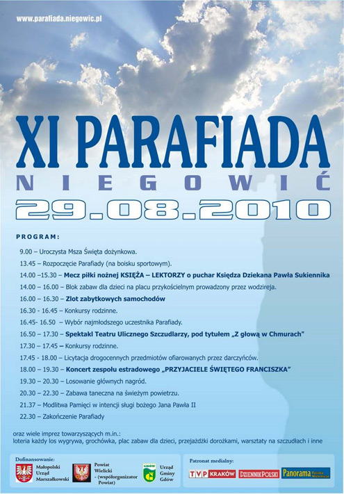 W najbliższą niedzielę, 29 sierpnia Niegowić zaprasza wszystkich na XI już Parafiadę, która rozpocznie się o godzinie 9:00 uroczystą, dożynkową Mszą Świętą. Następnie na boisku portowym nastąpi oficjalne rozpoczęcie tegorocznej Parafiady.